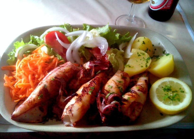 Советую попробовать португальскую паэлью. Это большая кастрюля с рисовым супом и океанической живностью: королевскими креветками, крабами, моллюсками, мидиями. Все это не очищено, клешни краба большей частью в панцирях, так что придется потрудиться, убирая несъедобные покровы морских жителей. Если всей душой любите морепродукты, то вкус изумительный! Также попробуйте осьминога в любом виде — жареного, вяленого, вареного или на гриле.