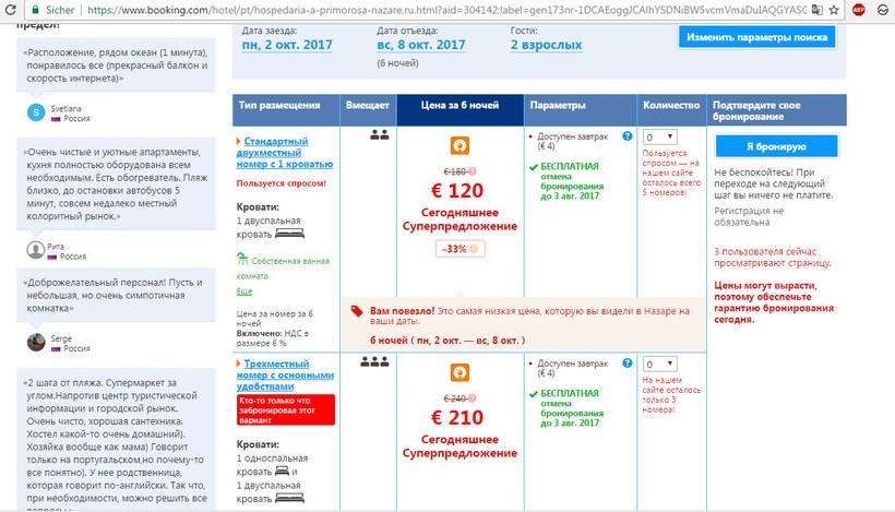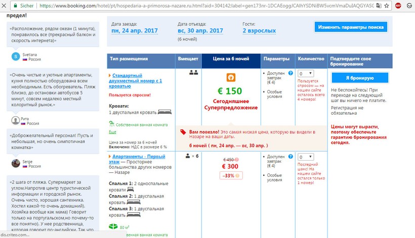 Если не думать о звездах, жилье в Назаре может стать не самой большой статьей расхода. Вот пример апартаментов на шесть ночей, без звезд, с хорошими отзывами на «Букинге» в апреле: