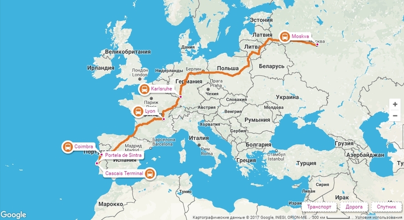 От гостиницы «Космос», что у метро ВДНХ в Москве, 4 раза в неделю отправляется автобус компании Ecolines и следует 47 часов до Карлсруэ. Оттуда можно ехать по следующему пути: Лион – Коимбра – Кашкайш – Синтра. Здесь важно заранее подобрать билеты, потому что автобусы на этом участке ходят далеко не каждый день.