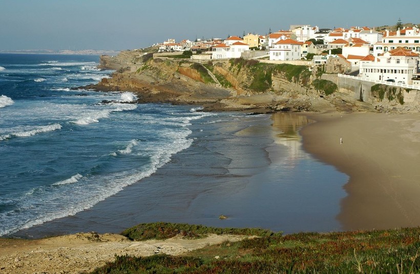 - Praia das Azenhas do Mar расположен в одноимённом живописном местечке. Отдельно я напишу о нём ниже, а сейчас расскажу о пляже. Он укрылся между отвесными скалами и представляет из себя совершенно небольшой, но очень привлекательный кусочек береговой линии. С северной стороны над ним на отвесной скале нависает город, а с юга можно полюбоваться на бескрайний океан – для этого здесь специально соорудили обзорную площадку. Ещё одна достопримечательность этого места – небольшой бассейн, естественным путём наполняющийся океанической водой. Во время прилива пляж полностью погружается под воду, а из развлечений (кроме плавания) здесь актуальна разве что рыбалка. До пляжа из Синтры от остановки у Portela da Sintra следуют автобусы №440 и 441.
