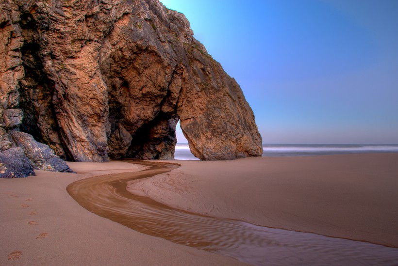 - Praia Grande – как следует из названия, это самый большой и великолепный пляж Синтры. Он пользуется большой популярностью среди серферов и бодибордеров, здесь же устраиваются спортивные соревнования в этих видах спорта. Северная часть Прайя Гранде порадует любителей поплескаться в воде одним из крупнейших в Европе бассейнов с солёной водой. Его длина составляет 100 метров, а принадлежит это чудо отелю Hotel das Arribas. Средняя температура воды в океане летом здесь составляет +18°C. А ещё одно развлечение, которое можно найти на южной скале пляжа – окаменевшие следы динозавров, датируемые аж ранним меловым периодом. Целых одиннадцать штук! Помимо окаменелостей, здесь можно полюбоваться разнообразной морской фауной, встречающейся в этом месте в изобилии. Пляж бесплатный, но если захотите посетить бассейн, имейте ввиду, что он только для постояльцев отеля и открыт с мая по сентябрь. До пляжа из Синтры от остановки у Portela da Sintra следуют автобусы №439 и 441.