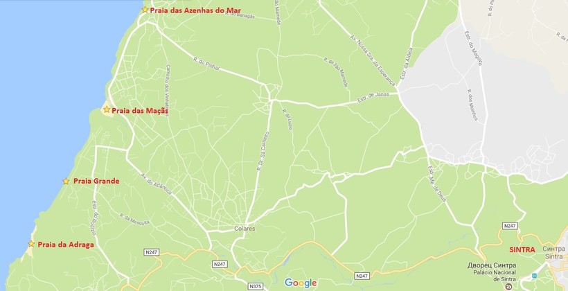 - Praia das Maçãs получил своё название от яблок, приносимых сюда течением впадающей в этом месте в океан реки Ribeira de Colares. Поэтому иначе его называют Яблочным пляжем. В летний сезон он очень популярен у местных жителей, которые либо живут в окрестностях, либо арендуют летние домики на побережье. Для любого желающего здесь есть прокат зонтиков, множество кафе и баров, души, а команда спасателей следит за безопасным отдыхом граждан. Это мой любимый пляж, потому что из Синтры в летний сезон сюда можно добраться по живописной дороге на полностью модернизированном традиционном трамвайчике. Весь путь по времени составит 45 минут, а описание маршрута читайте ниже. До пляжа из Синтры от остановки у Portela da Sintra следует автобус №441.
