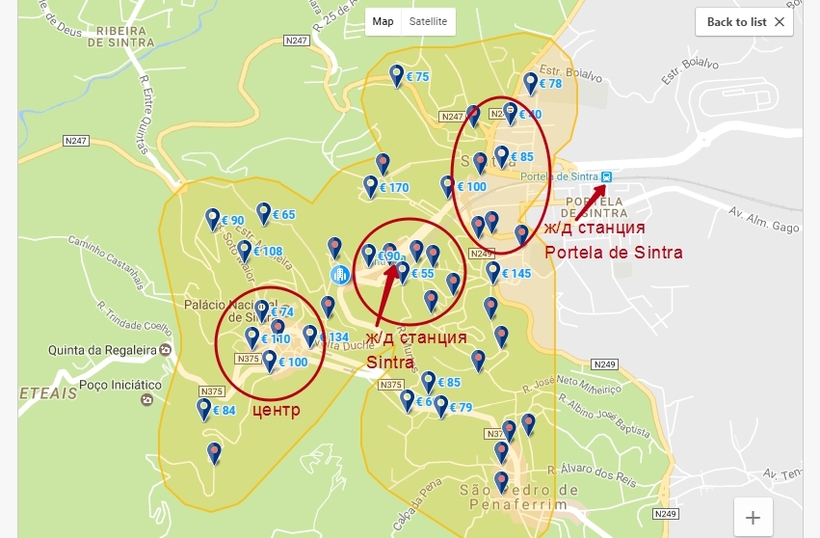 Стоимость за номер на одного человека в сутки начинается здесь от 20 EUR. Самые дорогие отели находятся в историческом центре, чуть дешевле – в районе ж/д станции Sintra, а у станции Portela de Sintra цены ещё ниже, зря туристы обходят вниманием этот район. Да, он не в центре города, но здесь в шаговой доступности от отелей находится остановка трамвая и пригородных автобусов, а до центра города всего 25 минут пешком. Поэтому я советую не обходить район стороной и обратить внимание на отели, которые окажутся на порядок дешевле, чем в центре.