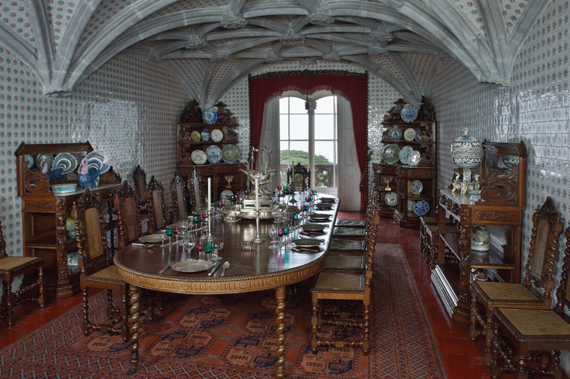 Под столовую королевской семьи была перестроена трапезная иеронимитов. Я была бы не прочь пообедать здесь. Сводчатый потолок декорирован в стиле мануэлино и облицован плиткой 19 века с фабрики Roseira, а дубовая мебель перевезена из Каза Гаспаро в Лиссабоне в 1866 году.