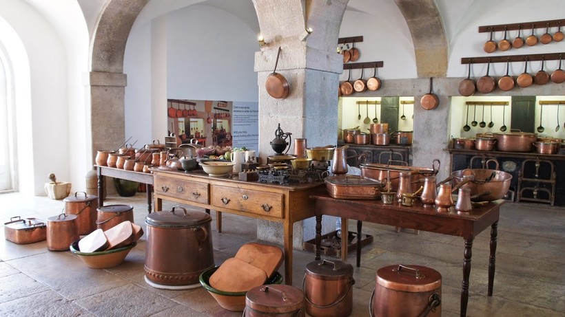 Интересно, что самым большим помещением дворца стала королевская кухня. Из трёх оригинальных печей сохранились две. А ещё здесь можно увидеть аутентичную медную посуду с маркировкой дворца.