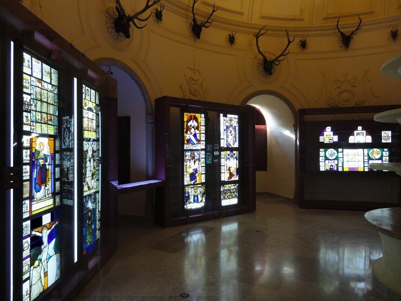 Банкетный зал, или Зал рыцарей, задумывался иначе. Здесь должны были быть витражные стекла в окнах, а на стенах предполагалась развесить оружие. Но и сегодня зал с круглым столом, окаймляющим центральную колонну, смотрится величественно. Нынешние посетители зала смогут оценить расположившуюся здесь коллекцию витражей.