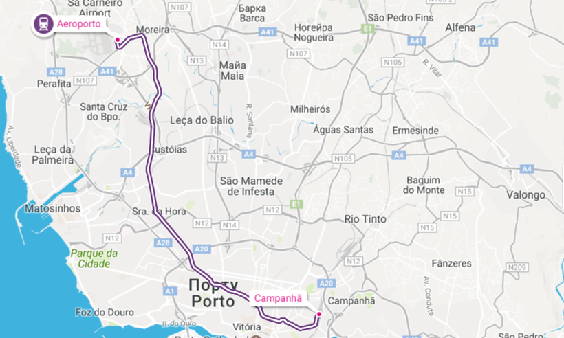 - На метро. Интервал движения поездов — 5 минут, доедете за 33 минуты. Ориентировочная стоимость билета — 1–2 EUR (более точная инфрмация на официальном сайте метрополитена Порту).