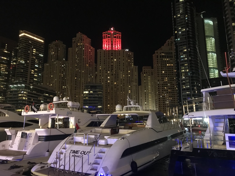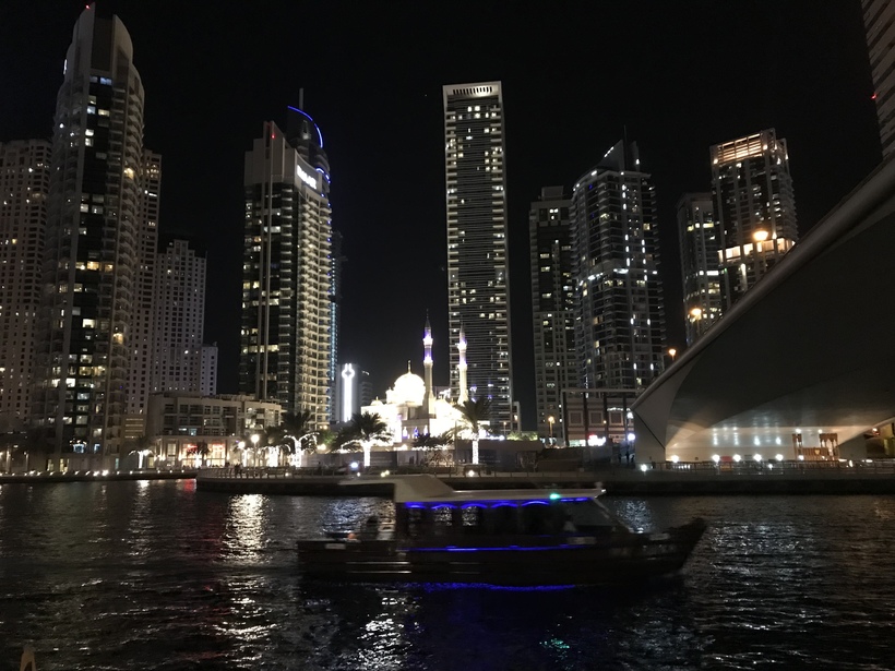 Во многих местах променада установлены скамейки. К сожалению, большинство из них находится на открытом солнце. Спокойно посидеть нам удалось только ближе к закату. На закате нас ждал еще один интересный аттракцион. После наступления темноты погавань начали крутиться прогулочные кораблики. Каждый них них был по-своему нарядно расцвечен. Проплывая мимо, они озаряли набережную огнями. Мини-круиз вдоль променада Dubai Marina Walk является одним из популярнейших развлечений в Дубае. Можно просто покататься, можно совместить поездку с ужином.