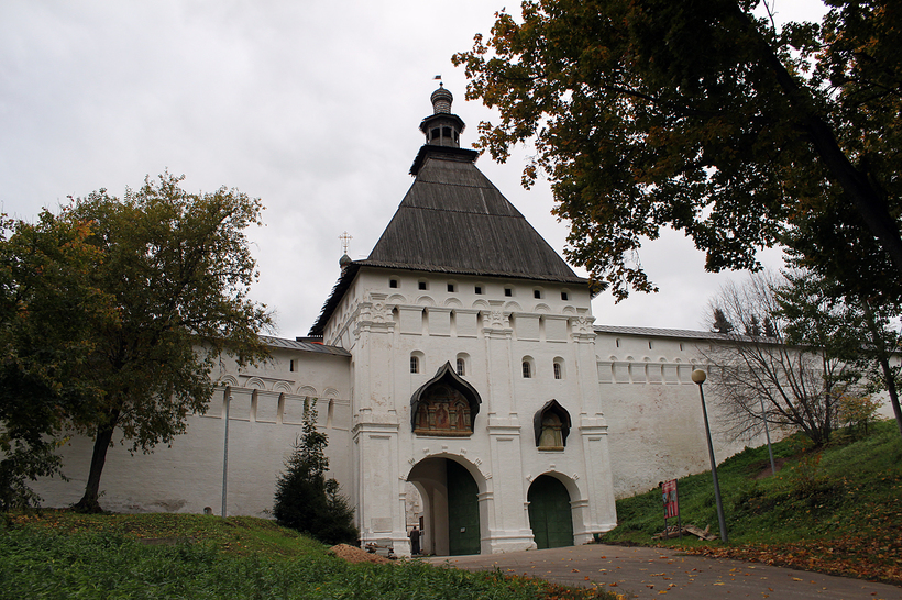 Итак, мы у монастыря. Прежде всего, бросаются в глаза его мощные стены и башни. Как и многие монастыри, Савино-Сторожевкий на протяжении веком являлся форпостом на западных границах молодого Московского княжества и принимал на себя удары вражеских войск. Во время одного из таких нашествий в начале 17 века он был разорен поляками.