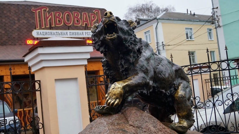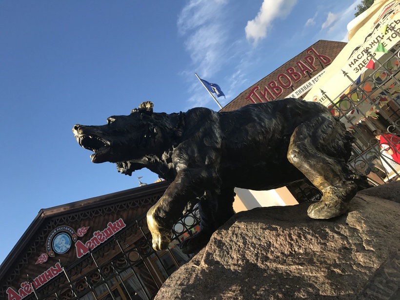 Лично у меня медведь никогда не ассоциировался с Россией. Мне всегда казалось, что это стереотип о нашей стране, засевший в головах иностранцев: бездорожье, люди в лаптях и медведи с балалайками, свободно разгуливающие по городам и весям. И, скажу вам, была знатно удивлена, увидев в центре Ярославля скульптуру эдакого брутального медведя, отнюдь не сказочного, а самого что ни на есть реалистичного, украшенного надписью "Символ России. Легенда Ярославля."