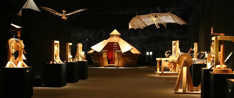 В первой комнате все экспонаты построены по чертежам Леонардо да Винчи. Их можно потрогать, повертеть, покачать. Здесь есть макеты военной и строительной техники, летательных аппаратов, шестеренок и часов, танка-убийцы (который так и не был воплощен в жизнь) и велосипеда (который был). Всего представлено около 40 машин.