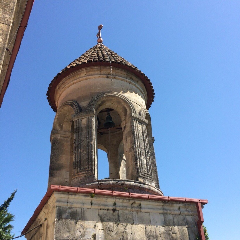 Такие есть на многих колокольнях в Грузии. Есть такая легенда, что раньше цепи были натянуты между колокольнями разных монастырей и храмов, чтобы монахи могли по ним ходить друг другу, а не идти в обход по горам. Но однажды монах, который шел по такой цепи, увидел, как внизу, в реке купается обнаженная девушка. Он потерял равновесие, упал и разбился. После этого цепи оборвали и теперь их можно видеть только лишь в таком состоянии. Уж не знаю, правда ли это, или вымысел, но история, как мне кажется, очень красивая!