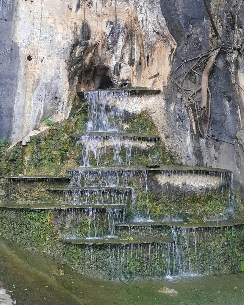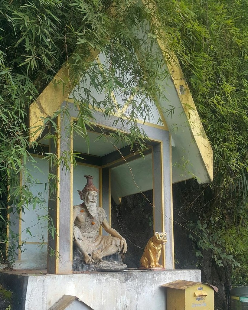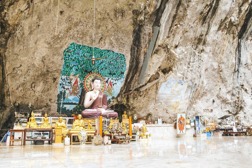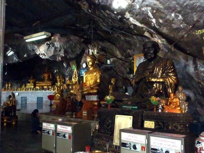 На самом деле пещерой называется сам храм, расположенный у подножья шестисот метровой горы. Помещение храма сформировалось естественным образом и священные статуи расставлены вдоль необработанных каменных стен. Между статуями есть проход в узкий коридор с небольшими пещерами, в каждой из которых находится какая-либо буддийская реликвия. Там есть пещера, где жил монах, основавших храм и пещера с отпечатком ноги Будды. Мы с первого раз не заметили этот коридор, поэтому обращаю на него внимание.