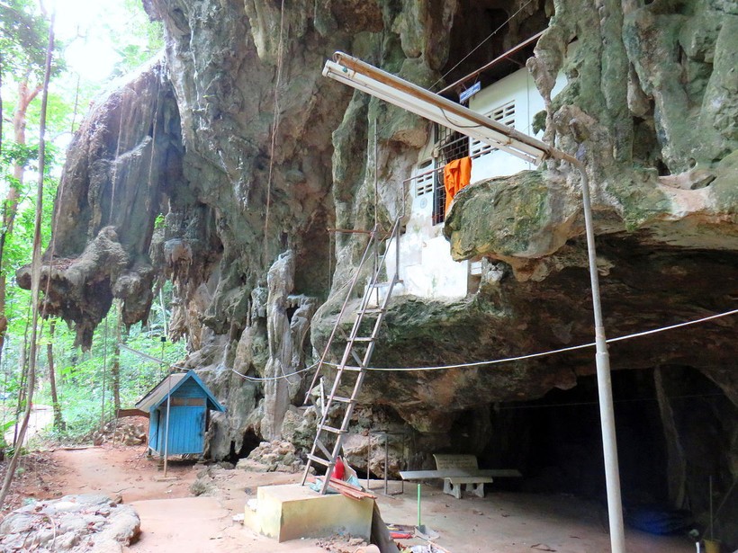 Кельи монахов расположены по левую сторону от тропинки, как грибочки прилипшие к возвышающимся над ними стенами. Некоторые монахи живут в домиках на сваях, кто-то в пещерах или гротах. Одна пещера была расположена высоко на скале и к ней вела приставная лестница.