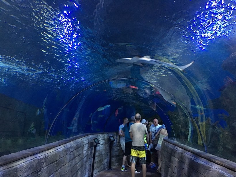 Сначала о плюсах. Аквариум прикольный. Он сделан очень красиво, он выглядит очень современно, и по нему приятно ходить, то есть он производит такое впечатление новенького здания. И, действительно, там есть всякие рыбки, шикарные аквариумные витрины, в которых ты наблюдаешь подводную жизнь, и прочая подводная суета.