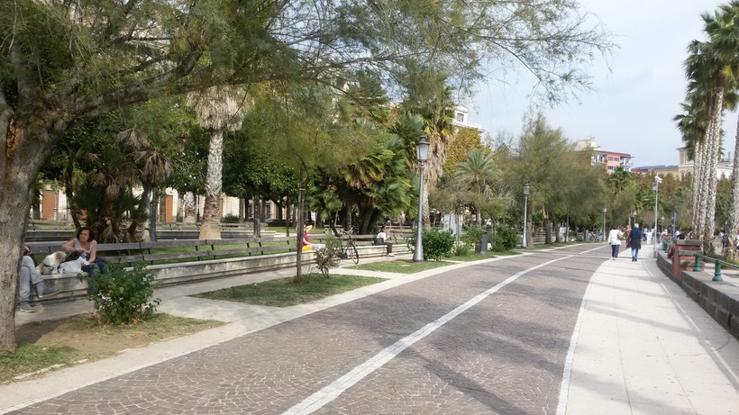Набережная Салерно - небольшого города на юге Италии - мне понравилась тем, что она довольно широкая и просторная. И это особенно ощущаешь после прогулки по узким улочкам исторического центра Салерно, на которых тесно и оживленно. А здесь сразу так комфортно, тихая и спокойная пешеходная зона. Высокие пальмы, клумбы, цветущие деревья и кустарники (в конце октября они цвели и радовали глаз).