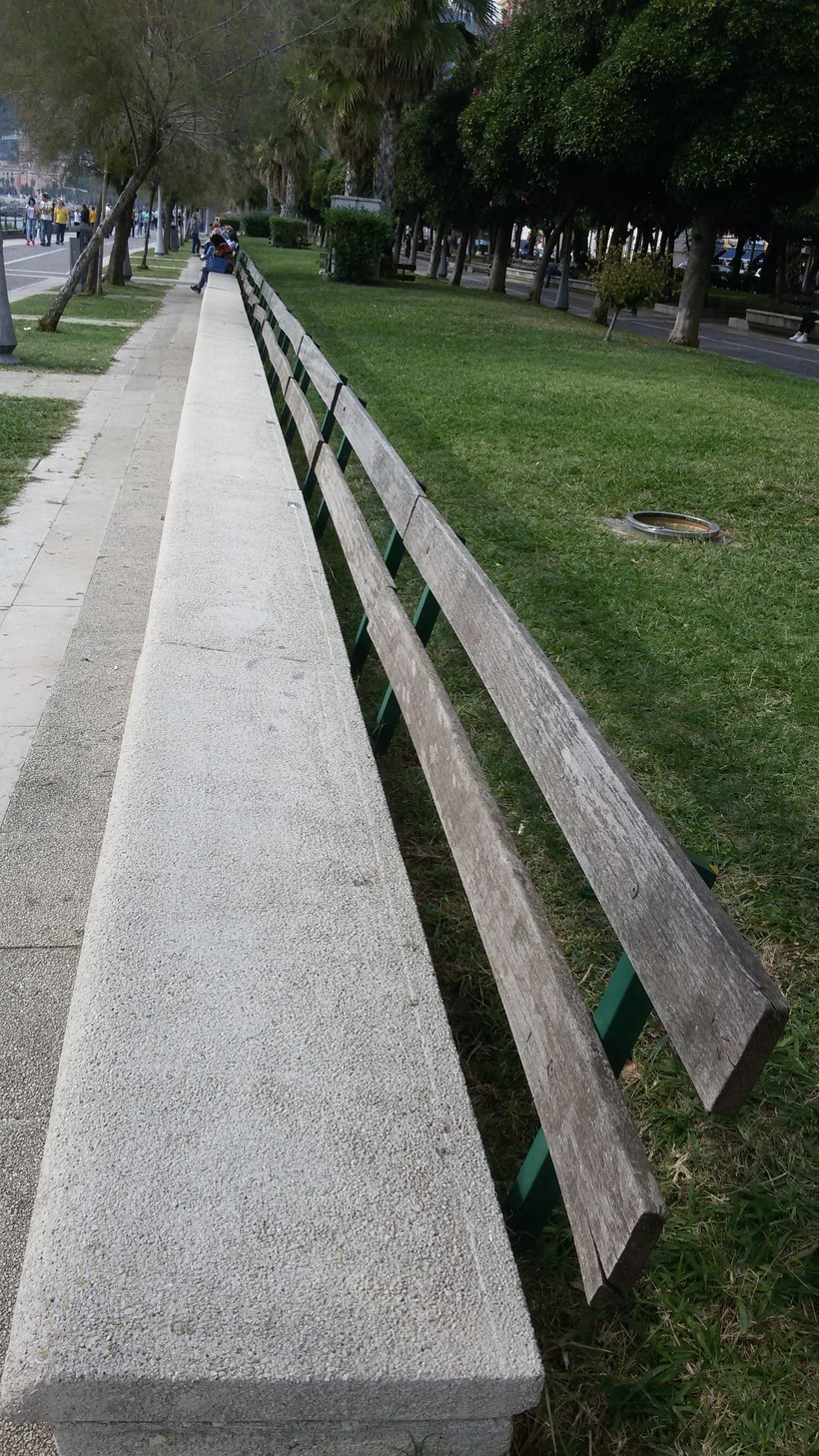 Что мне показалось интересным, необычным - это очень длинные скамейки. Каменые, с деревянными спинками. Сколько на каждой из них поместится? 20-30 человек? Они тянутся вдоль всей набережной, причем в два ряда. Так что найдется место для всех. Причем, все «посадочные места» с видом на море.
