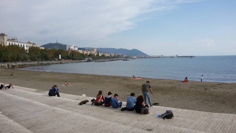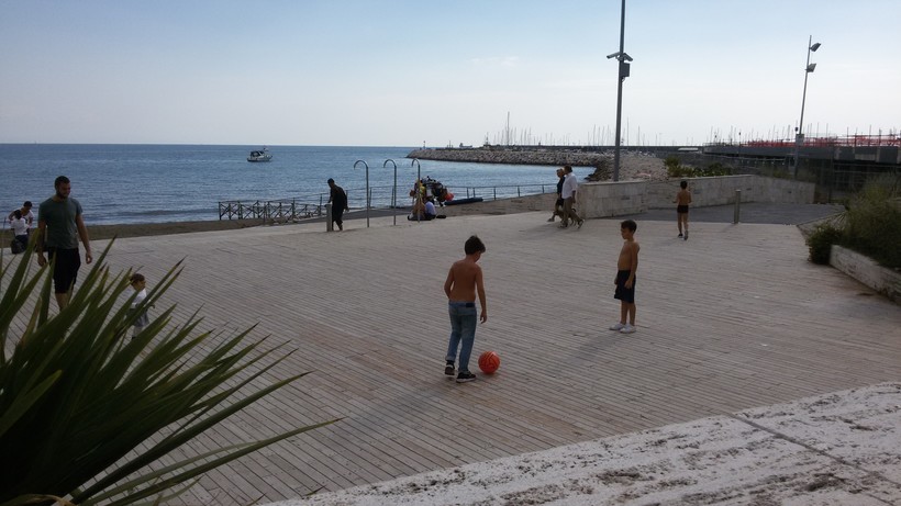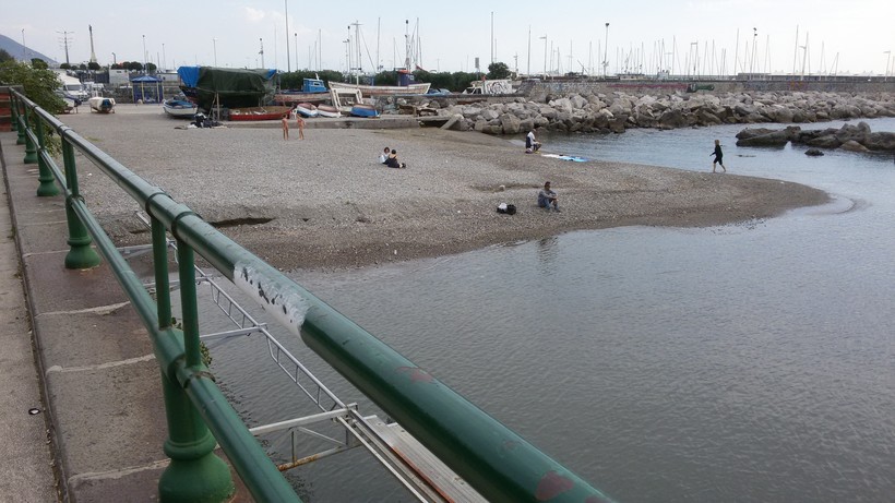 Более комфортный пляж находится в начале набережной. Опробовать его не получилось, не хватило времени, да и погода была не очень подходящей. Но со стороны мне пляж понравился: песочный, довольно широкий, есть душ (пляж есть на фотографиях). Когда не сезон, и не хочется сидеть на песке, можно отдыхать на деревянном настиле. А вообще, если пройти центральную широкую часть набережной и следовать дальше вдоль моря, там будет много пляжных зон, платных и бесплатных. Это в районе гранд-отеля «Солерно». Мы отдыхали там летом.
