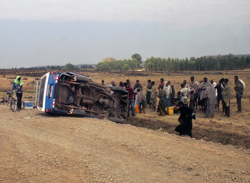 Что интересно, когда мы ехали обратно, часа через четыре, микроавтобус все также валялся в кювете. А у нашего автобуса лопнуло колесо, и меняли его часа два. Передвигаясь по Эфиопии, заранее запаситесь терпением и не тратьте понапрасну свое нервы, все равно быстрее не поедете.