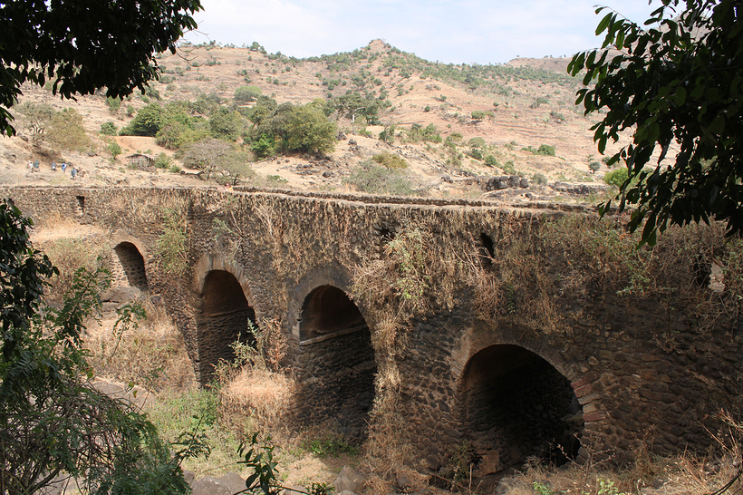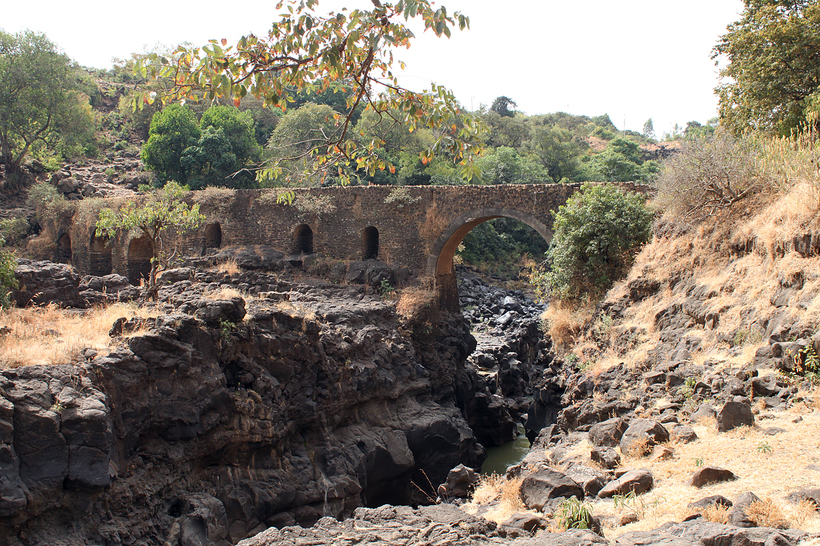 От поселка до водопадов около двух километров. Вначале вы пройдете по проселочной дороге, затем пересечете реку по вот такому мосту, построенному португальским миссионерами в 1625 году, это старейший в Эфиопии каменный мост.