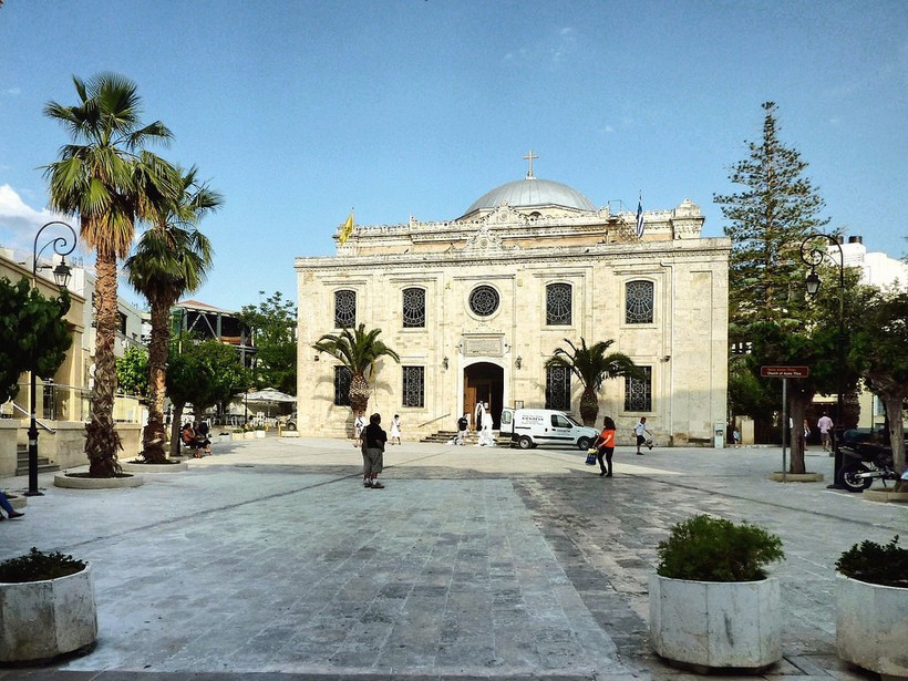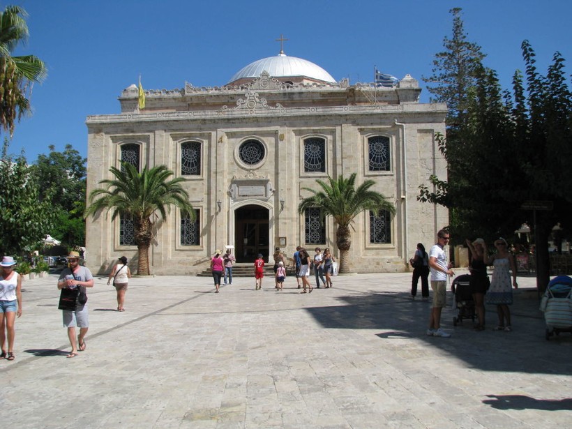 Храм был построен изначально православным. Но во времена византийского господства на Крите был переделан в католический. А во времена османского ига вообще был переделан в мечеть и носил название Визир-Джами. Затем опять вернут и обращен в православную веру. Хотя мне показалось, что убранство Церкви так и осталось католическим. Да и сама атмосфера внутри и вокруг здания больше похожа на католическую. Все скромно, белые стены. Пол отделан белым мрамором, а по периметру стоят ряды со скамейками для желающих помолиться. На всех окнах цветные витражи с ликами святых. Наверно, такая богатая история завоеваний этого здания и отложила на его стиль свой отпечаток. А крест, возвышающийся на здании так вообще определенно католический. Получается, в основу здания пришлось от каждой культуры по чуть-чуть.