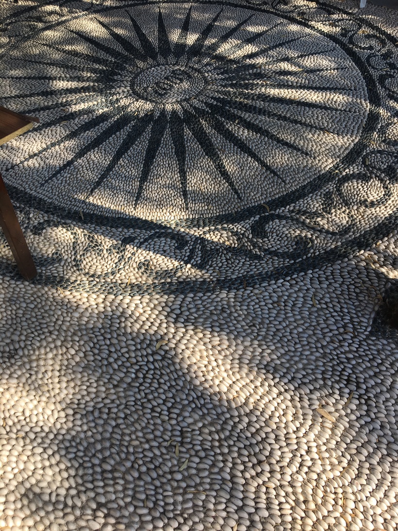 Весь двор выложен галечной мозаикой хохлаки, камешки для которой раньше поднимали в гору туристы и паломники: у подножия лежали маленькие мешочки, можно было взять один с собой и внести свой вклад.