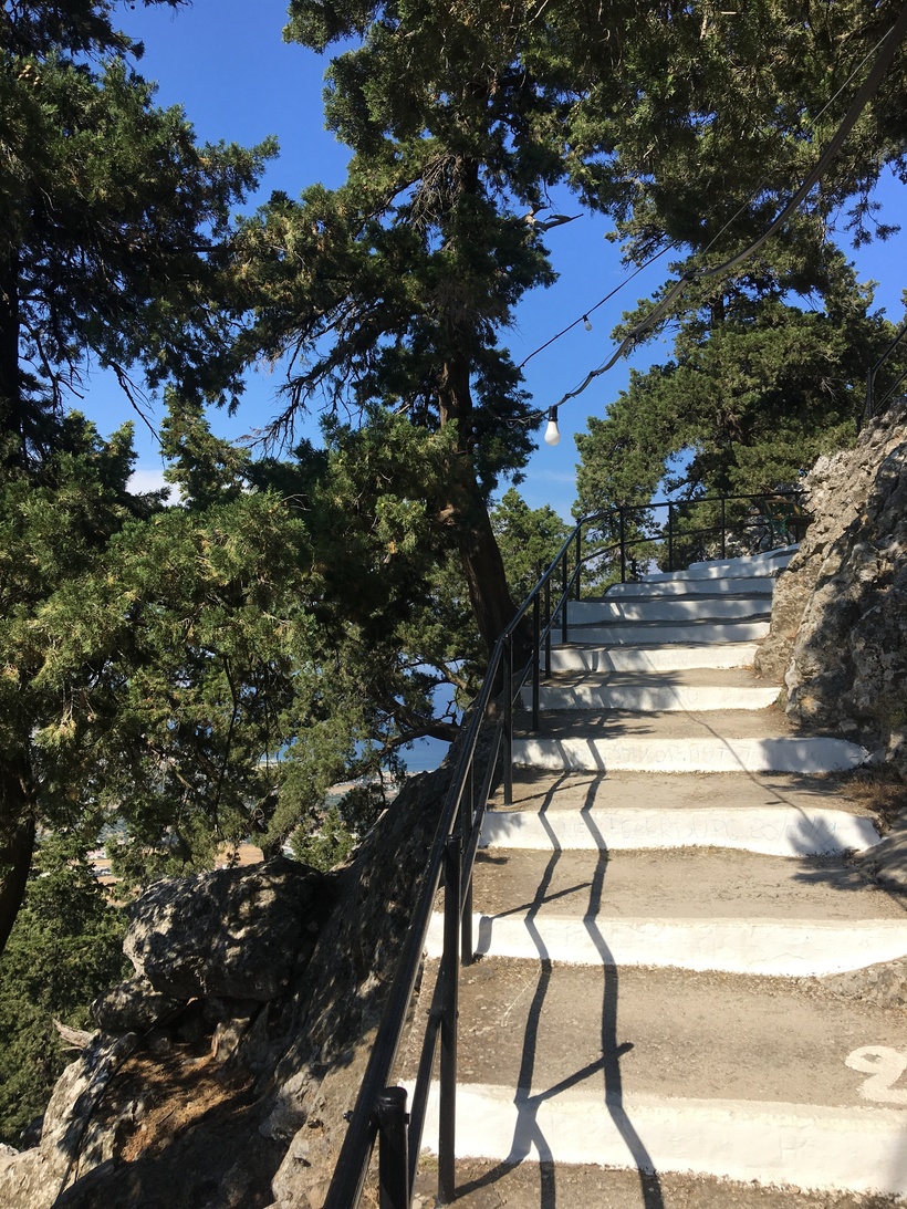 А потом начинаются ступени. И они, на самом деле, классные! Пронумерованные, тенистые, и всего 300 – то есть такое приятное обозримое количество. По пути есть несколько лавочек, в общем, хорошо!