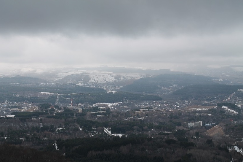 Наигрались в снежки на высоте 871 м над уровнем моря. Вид со смотровой площадки, конечно, не так порадовал глаз из-за хмурого серого неба. Март, на то он и март, даже в Кисловодске. С утра было солнце, с обеда пошел снег. Так что лучше взять теплую одежду с собой.