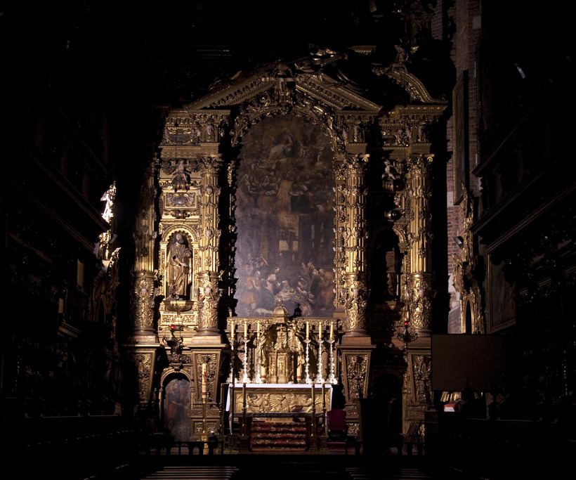 - Удивиться обилию золота. С улицы церковь выглядит, при всех своих масштабах, довольно скромно, поскольку выполнена, в основном, из красного кирпича. Ну а внутри вас ждёт золотое великолепие стиля барокко, на которое готическая строгость была заменена в 18 вв. В день моего визита, освещение было наполовину выключено, и оттого мерцание золота в лёгком полумраке показалось мне ещё более загадочным и прекрасным.