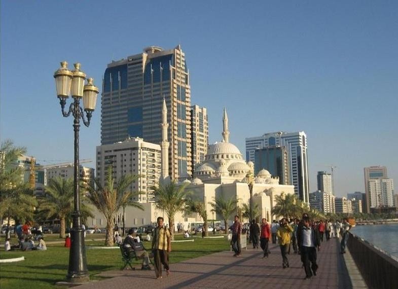 Зачем ехать. Я не могу назвать мечеть шибко выдающейся. Она приятная на вид, но и только. Внимание к зданию привлекает удачное расположение. Мечеть стоит на набережной Шарджи, почти рядом с водой, а на заднем плане высятся небоскребы. Я счел фон очень удачным. Если снимать мечеть, то она выходит символом сохранения Объединенными Арабскими Эмиратами своих культурных традиций. Видно, что современность в виде высотных зданий наступает, но местные жители чтут свое прошлое и свою веру.