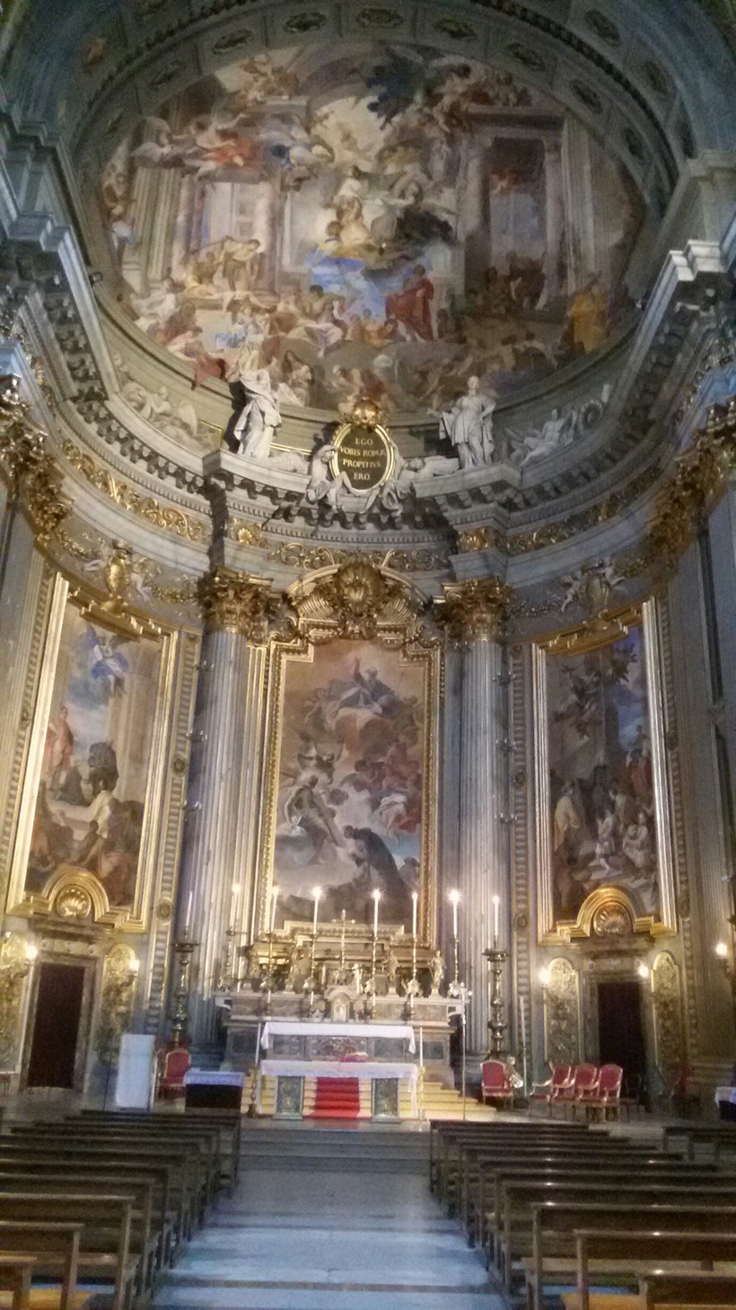 Я для себя отметила, что в каждой римской церкви есть какой-то секрет, такая интересная отличительная особенность. Так вот, секрет церкви Сант-Иньяцио - в куполе. Дело в том, что снаружи его нет: когда строили, решили сэкономить, или денег не хватило – разные версии. Но внутри купол есть! Вернее, кажется, что есть. Плоский потолок художник и математик Андреа Поццо расписал таким образом, что создается иллюзия купола. Только смотреть нужно из определенной точки, отмеченной на полу. Такой вот оптический обман.