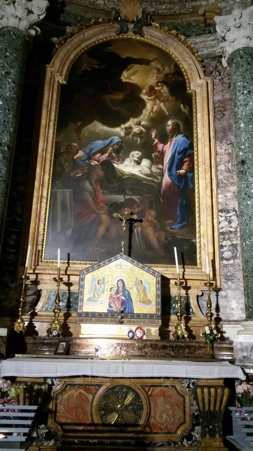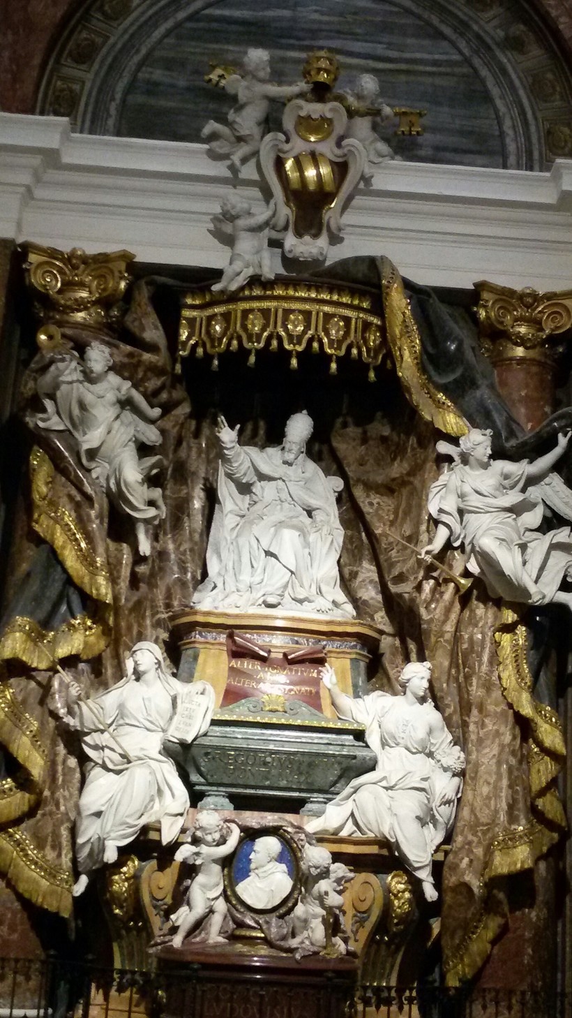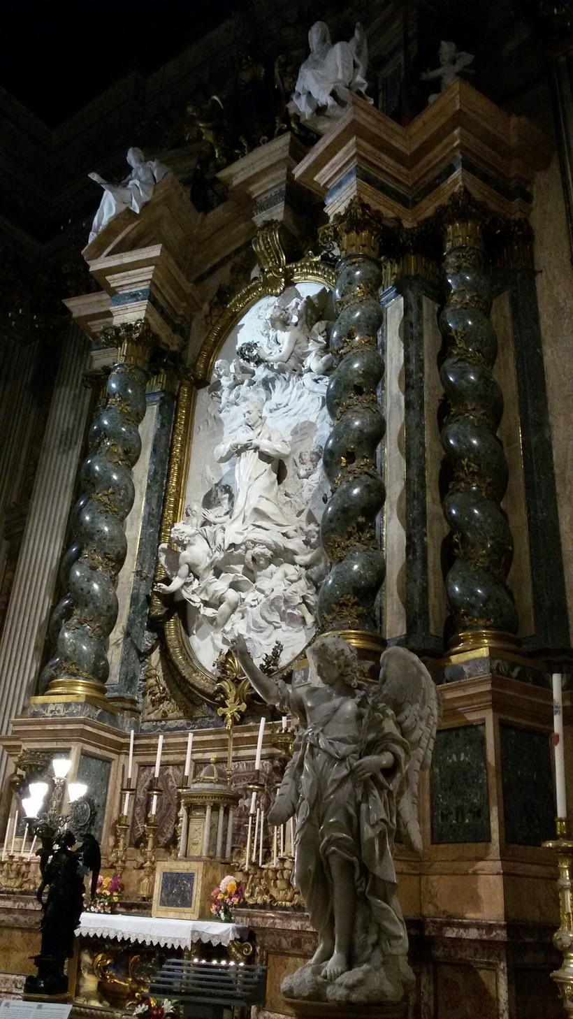 И вторая – капелла Ludovisi – необыкновенно красивая скульптурная композиция с памятником в центре, который окружают белоснежные ангелы на фоне темно-коричневого балдахина. Мраморные складки балдахина, тоже с позолотой, так легко ложатся, словно бархатные, а не каменные…