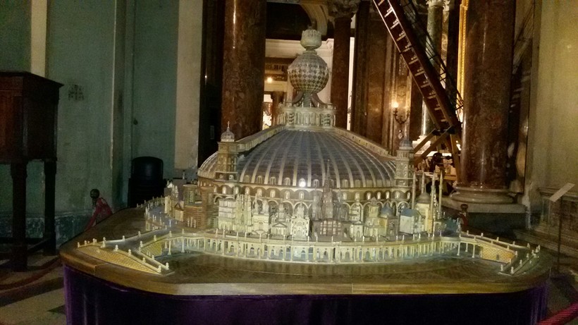 Но я обнаружила в этой церкви еще одну достопримечательность, и создана она уже руками нашего современника. Справа от входа, перед первой капеллой, стоит необычная деревянная модель. В центре – большой купол храма, вокруг него установлены миниатюрные макеты различных церквей мира.