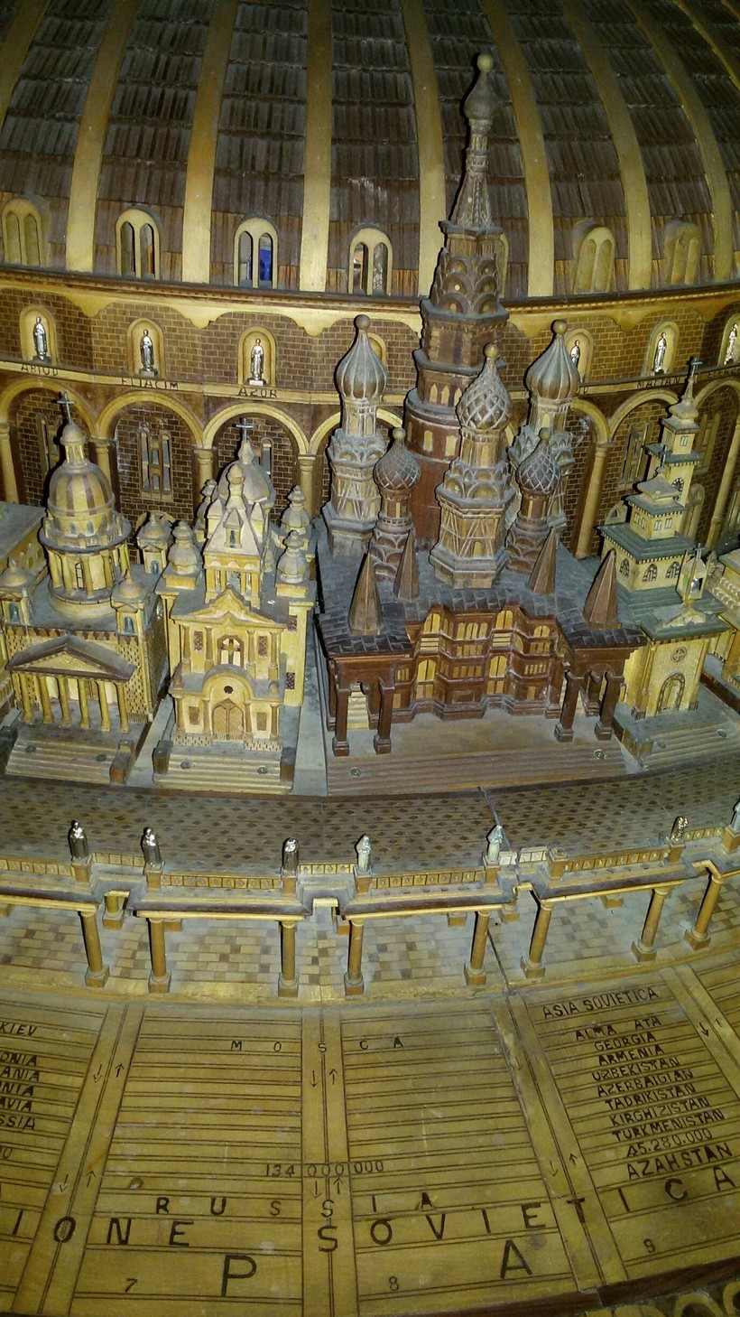 Есть информационная табличка на итальянском и английском. Идея этой модели – единая церковь, объединение людей различных религий. Ее автор - Винченцо Пандольфи - начал эту работу в 70 лет, и закончил её, когда ему было уже 98. Модели храмов выполнены очень искусно, подписаны так старательно.