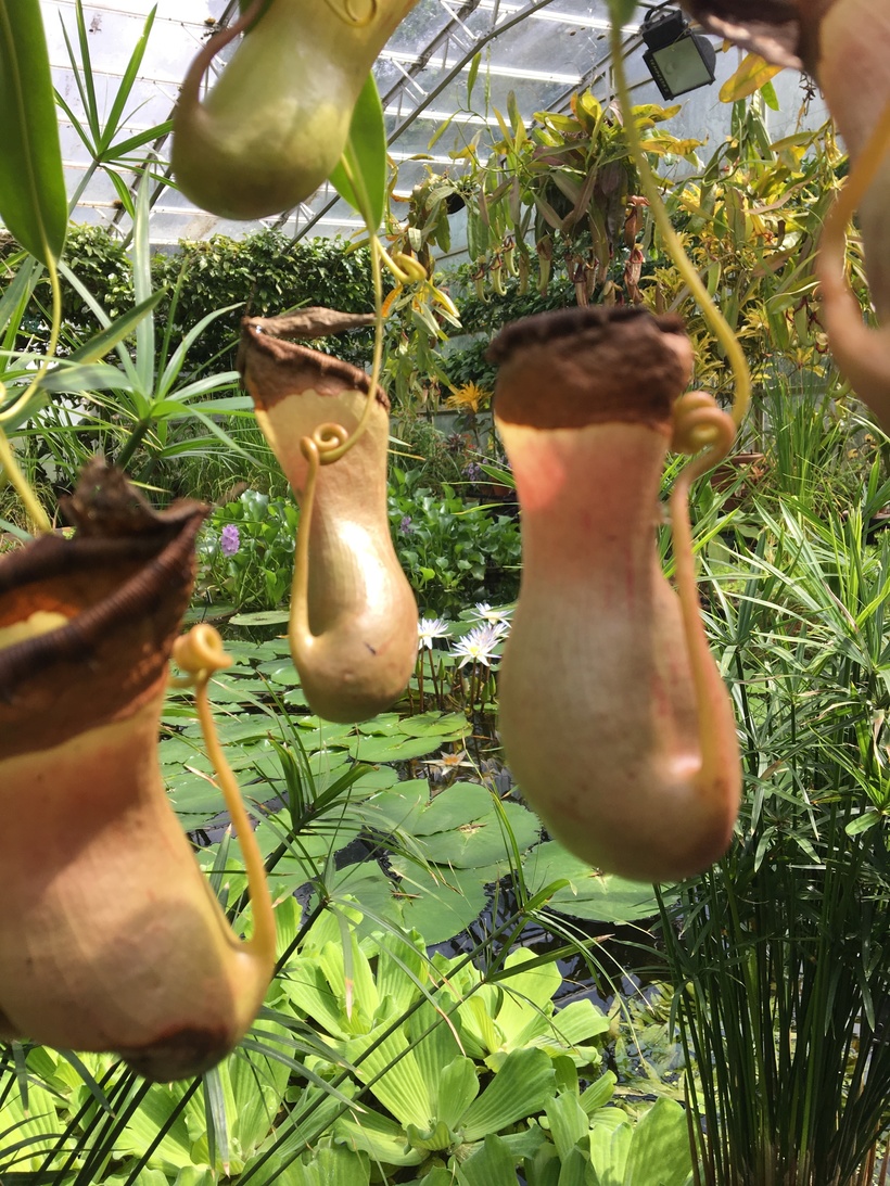 На берегу реки расположены теплицы с редкими растениями. Павильонов несколько, они разные по тематике. В одной из них пруд с водными растениями.