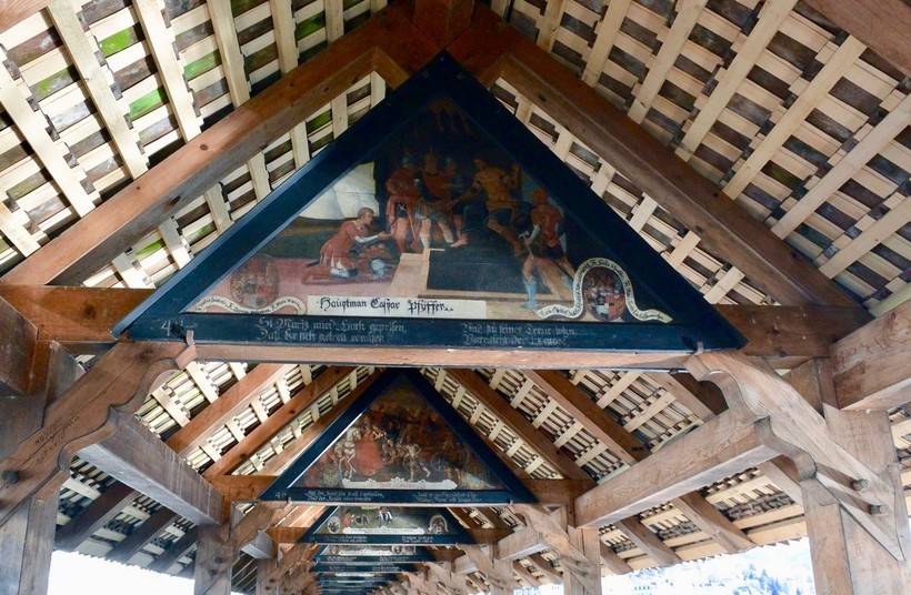Мост является пешеходным, внутри под крышей располагается больше сотни картин, изображающих самые значимые события в истории государства. Я с любопытством разглядывала их - здесь интересно и приятно прогуливаться.