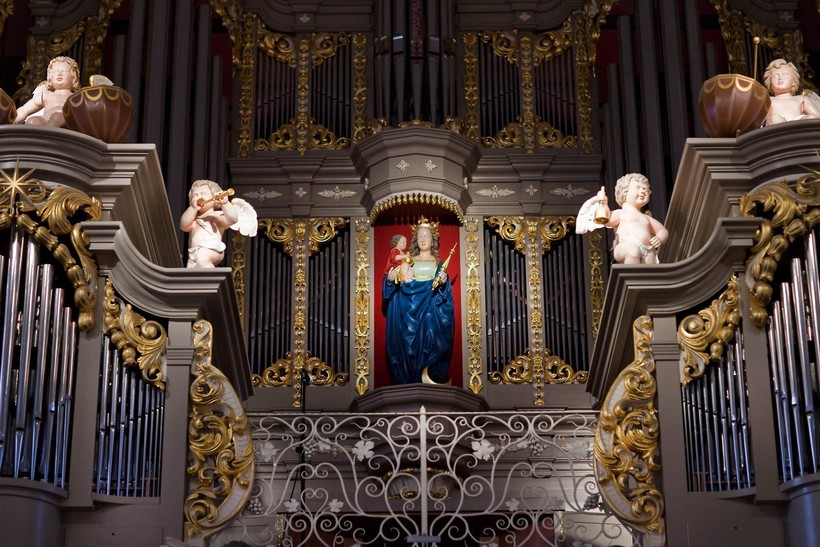 В одном конце стоит орган, на котором тоже расположены статуи, всё резное, позолоченное, просто необыкновенно и обворожительно!