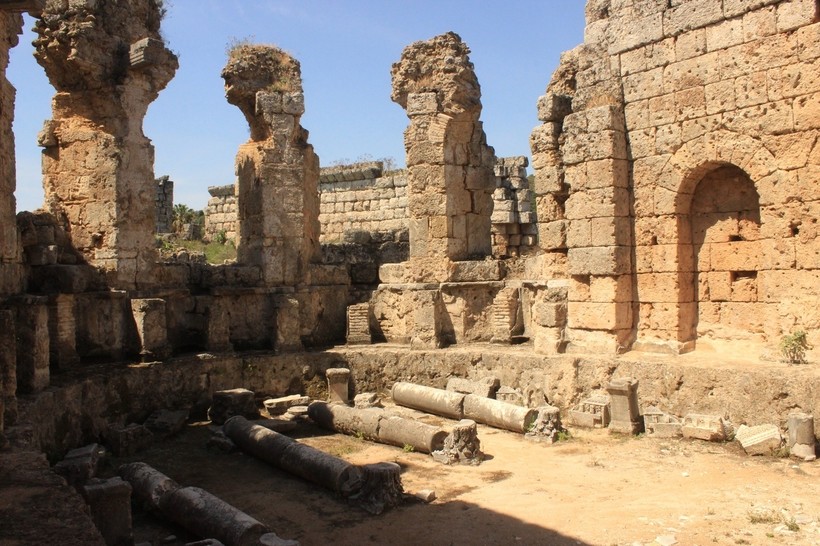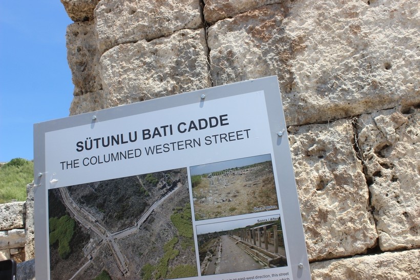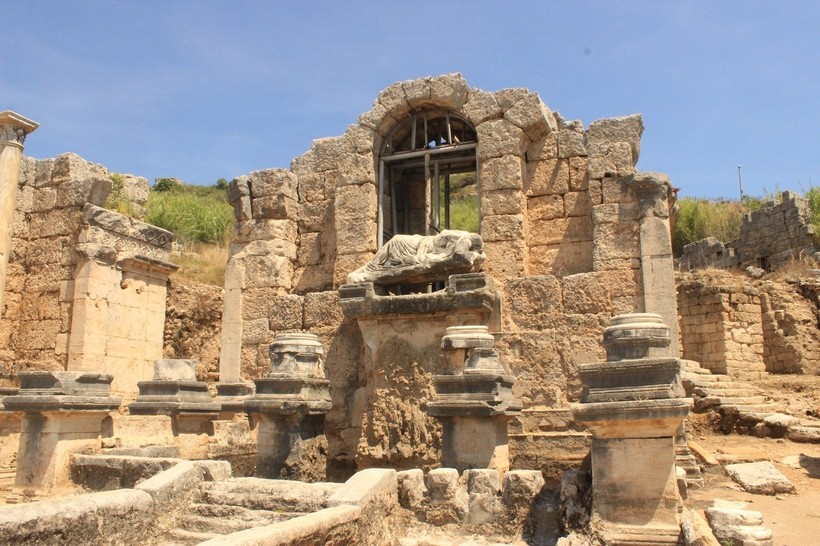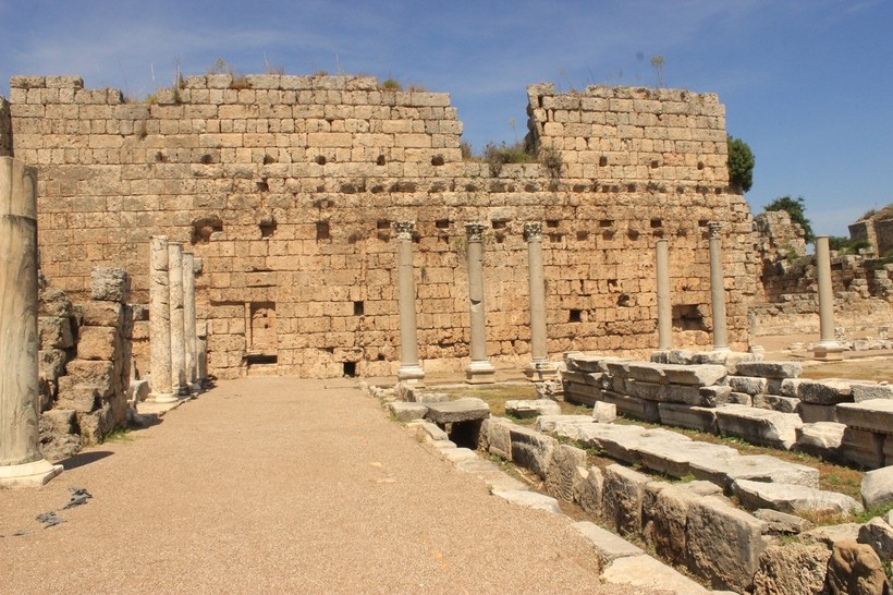Следующей частью Перге, куда стоит заглянуть — это вторая колоннадная улица с высоченными стенами от Гимназиума и небольшим святилищем, в котором хранится мозаика, посвященная Троянской войне. По преданию, ее привезли с собой троянцы. Здесь же еще один храм и выход к Некрополю, который к сожалению вот уже пару лет закрыт из-за раскопок, а я так хочу посмотреть на саркофаги, стоящие не в залах Анталийского музея, а в своей аутентичной среде.