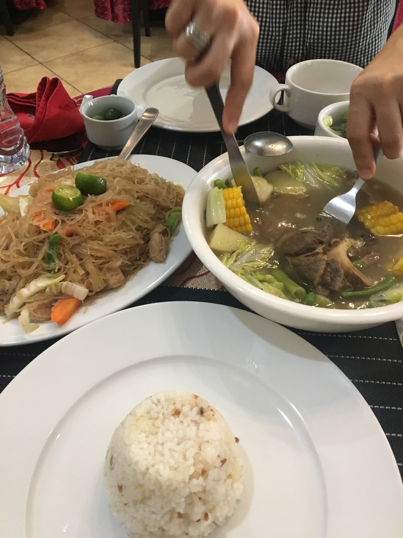 Пансит кантон (Pansit canton) -филиппинская лапша, чесночный рис (garlic rice) и суп с овощами и говядиной (Sinegan). Небольшой лайфхак- если хотите сделать вкус лапши совершенным-добавьте рыбный соус и выжмите сок каламанси. Perfect!