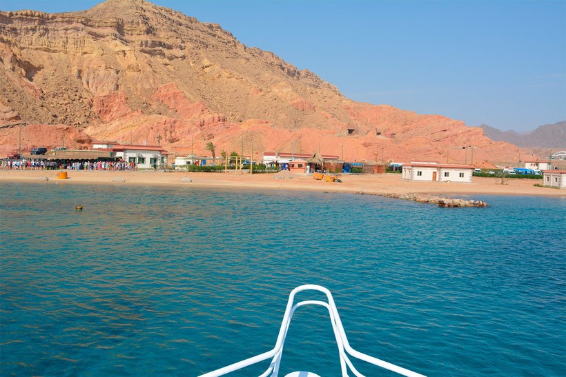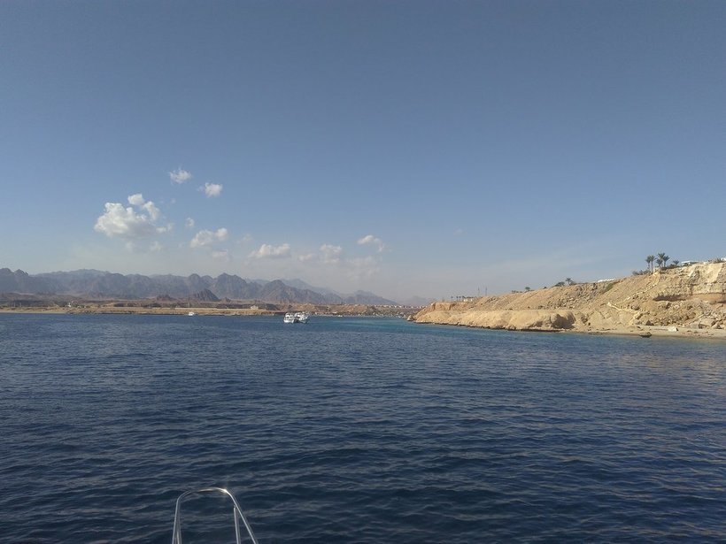 Пока мы шли к острову, я любовалась под шум ветра прекрасным пейзажем. Море и очертания берега, на котором раскинулся Шарм-эль-Шейх. Еще в конце 1980 гг он был простым поселком.