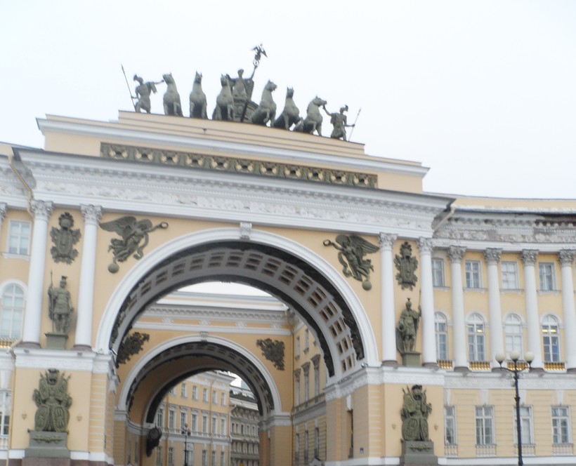 Но и само здание Главного штаба – это предмет архитектурного искусства. Как я уже написала, два крыла здания соединяются аркой. Она на самом деле больше, чем кажется при первом беглом взгляде. Правую и левую сторону арки украшают рельефы и горельфы отважных стражей, а сверху внимание посетителей приковывает колесница, которая будто прямо сейчас отправиться в свое героическое сражение. Она была здесь установлена в честь Отечественной войны 1812 года. По бокам от арки установлены ее белые колонны, которые простираются еще на несколько метров в обе стороны, будто обрамляя оконные проемы второго этажа. «Вглубь» арка повторяется трижды, выводя посетителей к уютным кафе и милым магазинчикам. Само здание выполнено в приглушенных желто-бело-коричневых тонах.