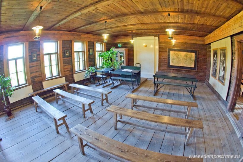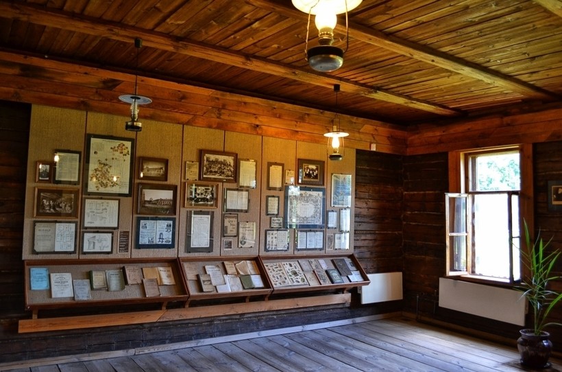 Земская школа. Сложенное из брёвен здание старой школы также небольшое, и имеет всего несколько классов. Скрипучий пол. Простые деревянные лавки. Старая карта мира на стене. Школьная доска. И запах истории. Здесь можно посмотреть фотографии учащихся тех лет.