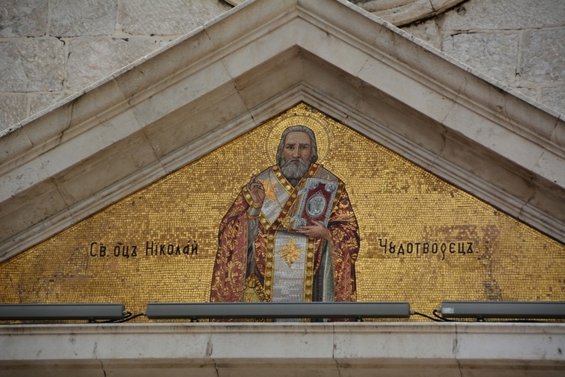 Над входом возвышается красивейшая мозаика, на которой изображен Николай Чудотворец. Он как бы приглашает посетить свою Церковь всех желающих. От Церкви идет стена городской крепости. На этом участке можно подняться и посмотреть городской вид. Но мы не стали тратить на это время, так как уже поднимались на стены Которской крепости. И лучше, чем оттуда вид на город, больше нигде не откроется.