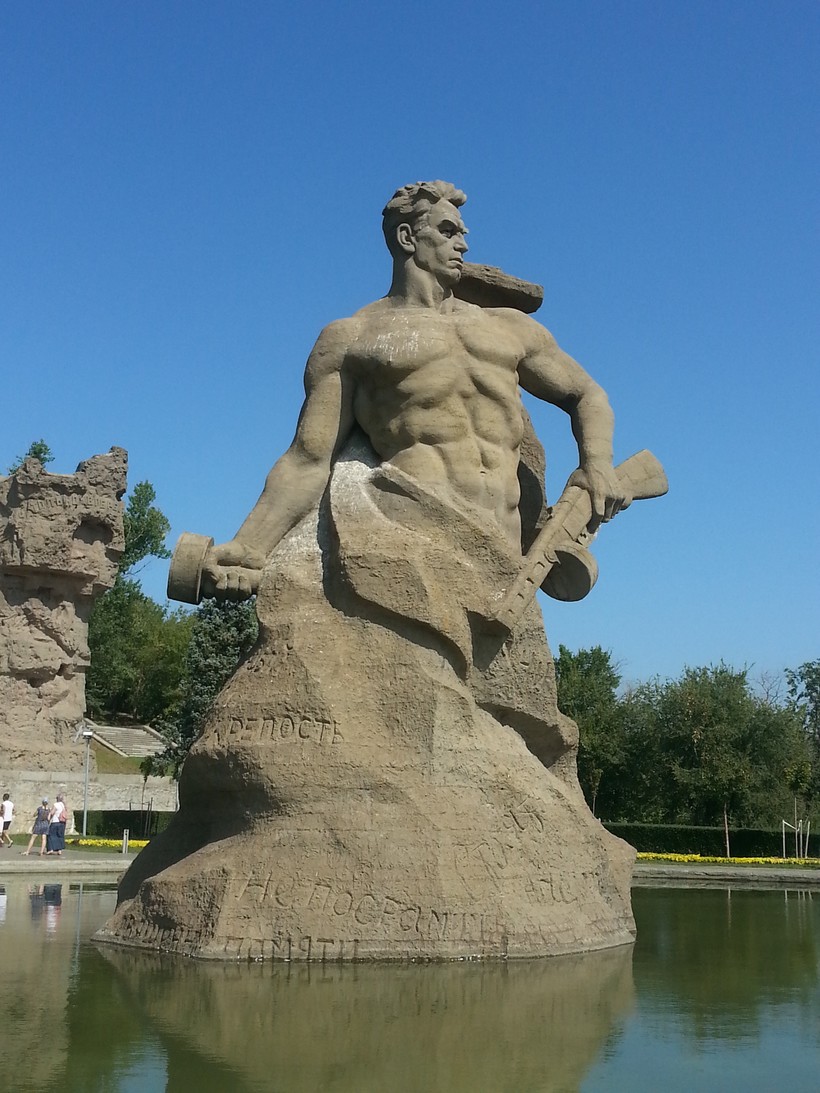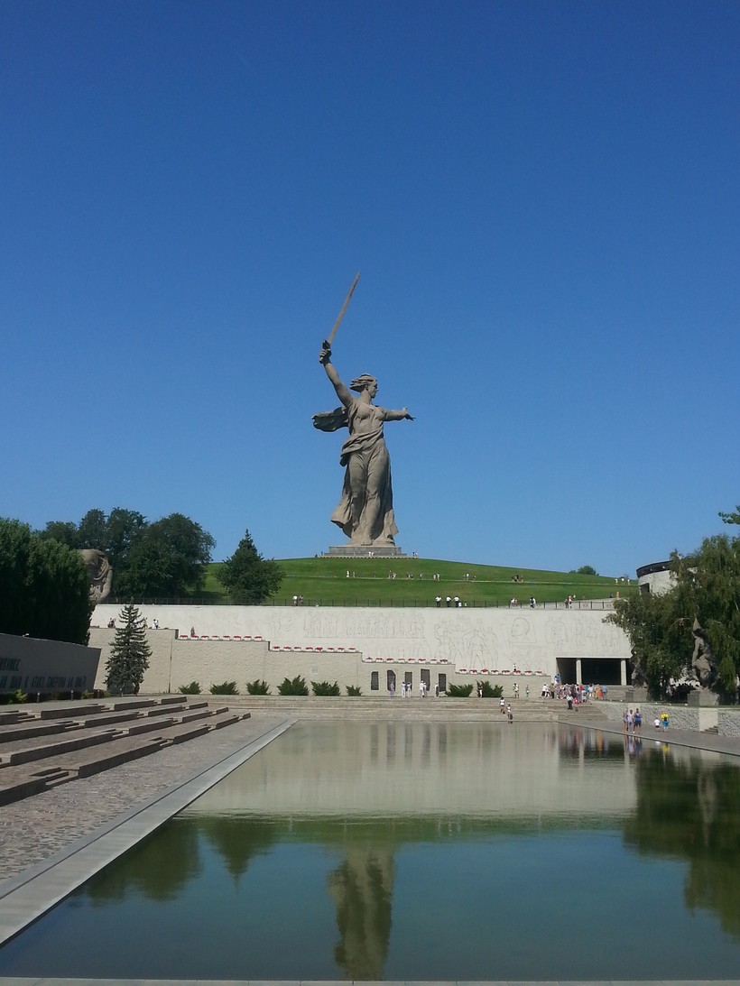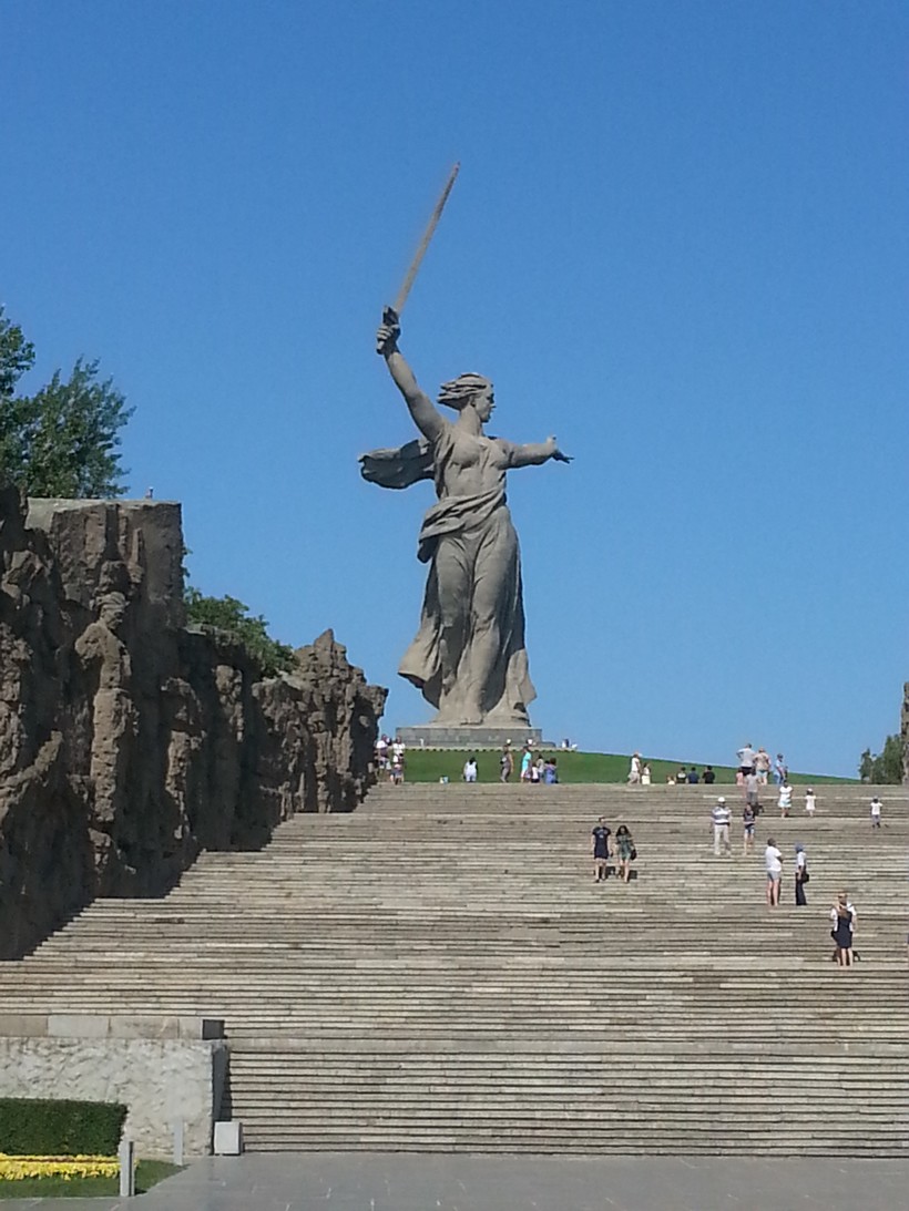 Сложно описать мои чувства, когда я находилась у подножия Родины-матери...Это и гордость, и замешательство, и вера, и страх, и радость, и печаль. Стояла на вершине и смотрела вдаль, любуясь волжскими разливами, голубым небом и даже трубами промышленных предприятий. Думала о своей огромной стране и героическом русском народе, сумевшем отстоять свою родину от захватчиков. Я не могу назвать себя истинным патриотом. Но в тот момент я была патриотом до глубины души...