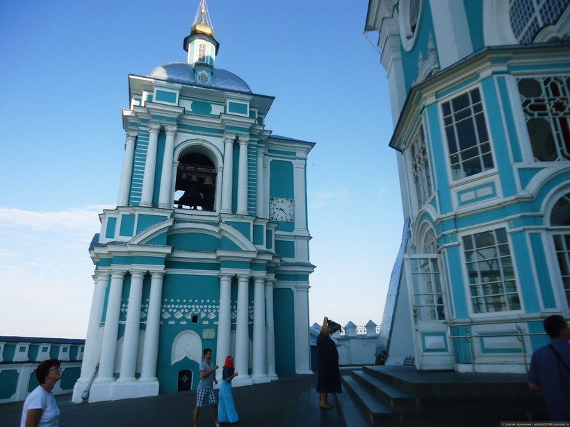 Собор находится в старой части Смоленска и вблизи кажется гораздо больше, чем на расстоянии. Он представляет собой пятиглавый храм с квадратным основанием и отдельно стоящей колокольней.