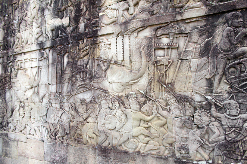 Стены и колонны храма на многих участках декорированы искусной резьбой, изображающей сцены повседневной жизни кхмеров. Можно найти много интересных деталей и узнать интересные подробности их быта. Особенно мне запомнилась эпическая сцена битвы кхмеров с чамами на озере Тонле-Сап.
