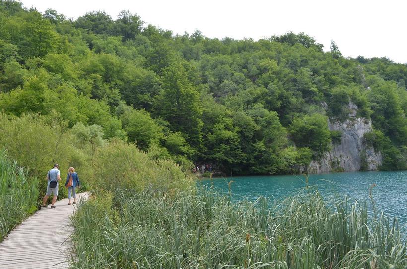 Постепенно уходящая вниз зигзагообразная дорога перешла в пологую тропу. Мы сначала удивились, почему приходится идти по деревянному настилу, а не по земле, потом сообразили, что хорваты стараются беречь уникальную природу. На этом участке пути нам пришлось не столько смотреть на окружающую красоту, сколько под ноги: деревяшки не очень ровные, и периодически они переходит в ступеньки.