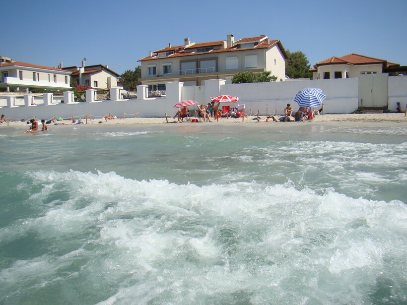 Плюсы этого места: Необычная архитектура на пляже, он тянется вдоль заборов летних коттеджей. Плавный набор глубины, на расстоянии более 100 м все еще глубина с 1 м. Приятное песчаное дно бухты. Чистая прозрачная вода глубокого синего цвета.