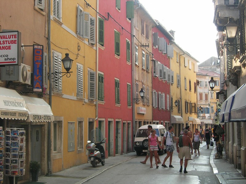 Старая часть Ровиня довольно компактная, ее размеры примерно 500 на 300 метров. Но легкой прогулки не получится: хотя уклон улиц не так уж велик, повсюду неровности, часто в неожиданных местах попадаются ступеньки, плиты отполированы, т.е. поскользнуться или оступиться проще простого. Я предусмотрительно обулся в кроссовки с рифленой подошвой, но девушки, решившие не парить ноги и нацепившие босоножки, неоднократно ругались на выбоины, способные, по их словам, убить хорошую обувь. Одним словом, к экскурсии нужно приготовиться, а после нее пообедать или выпить кофе, чтобы дать отдых натруженным ногам.