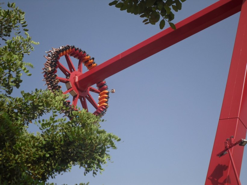 - Маятник. Он раскачивается в вертикальной плоскости, а на его конце находится крутящийся диск, к которому приделаны кресла «жертв». Тоже весьма хардкорный аттракцион, но именно с него открываются самые крутые виды на парк. Главное, не зажмурьтесь от страха;)